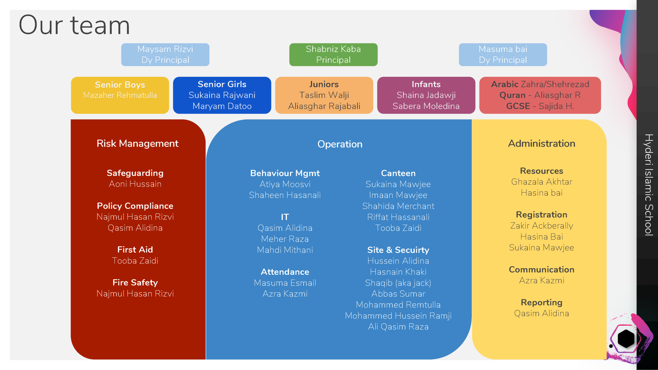 At Hyderi Madressa our vision is to create a happy, caring and enriching learning environment where children learn the formal tenets of Islam as well as nurture their spiritual growth and refine their moral characters so that they may grow to be (exemplary role models/reach their full potential / become practicing Muslim) and positive members of the community and society at large.